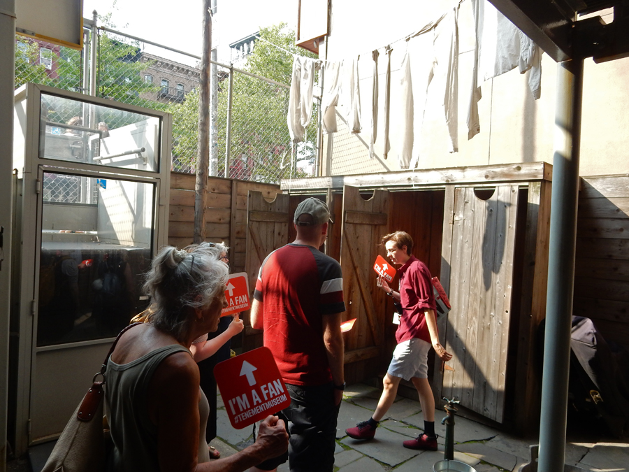 There are 7 apartment tours, each telling a different immigrant story. There is also a recreated German beer saloon and several neighborhood tours. We chose the “Irish Outsiders” ($20 seniors) tour on the fourth floor of the tenement – no elevator or AC but they did give us hand fans! The outhouses and water pump (only source of water) was in a small courtyard. So, there were many up and down trips every day.