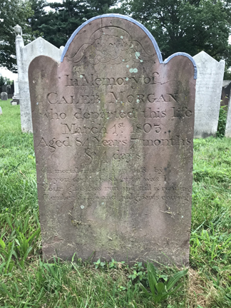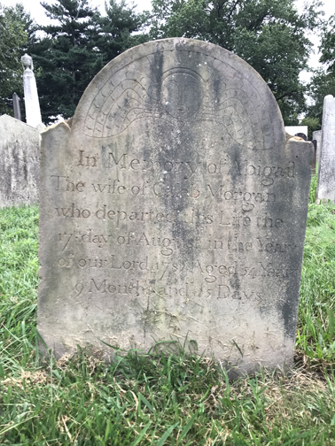 Abigail Morgan grave – The wife of Caleb Morgan who departed this Life the 17th day of August in the year of our Lord 1782 Aged 54 Year 9 Months and 25 Days. Cherub on stone represents the soul in heaven