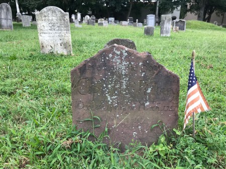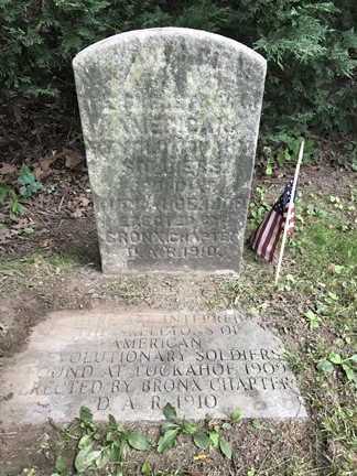 Flag and plaque identify the grave of a Revolutionary War soldier