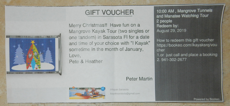 1/18 F – 10am kayaking with I Kayak; launched on South Lido Key and did the Mangrove Tunnel guided 2.5hr tour in Sarasota Bay