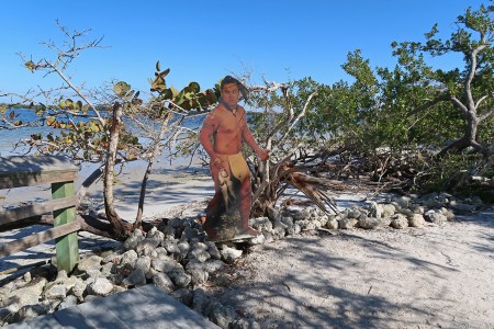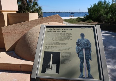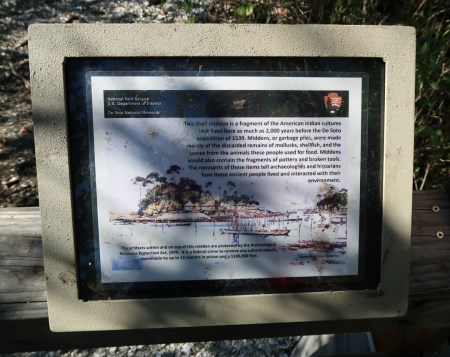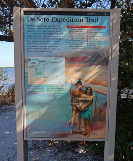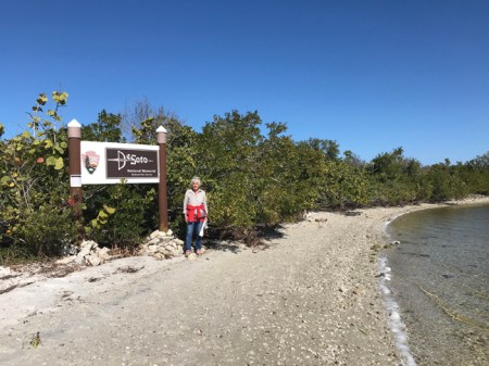 1/11 F – 44 degrees this morning! Drove a half-hour to De Soto National Memorial, which was closed due to the government shutdown. However, we were able to walk through the grounds and hike about a mile on the trails around the memorial and along the Manatee River. We came prepared to pick up trash, but others had already done a good job. I toured this National Park Unit in 2009 but this was Helen’s first visit. The following pics tell the story –