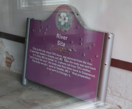 Inside the window was a bullet riddled sign that had recently been removed from the spot on the Tallahatchie River where Till’s body was found. The new sign outside of Glendora MS already has bullet holes in it!
