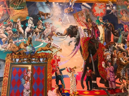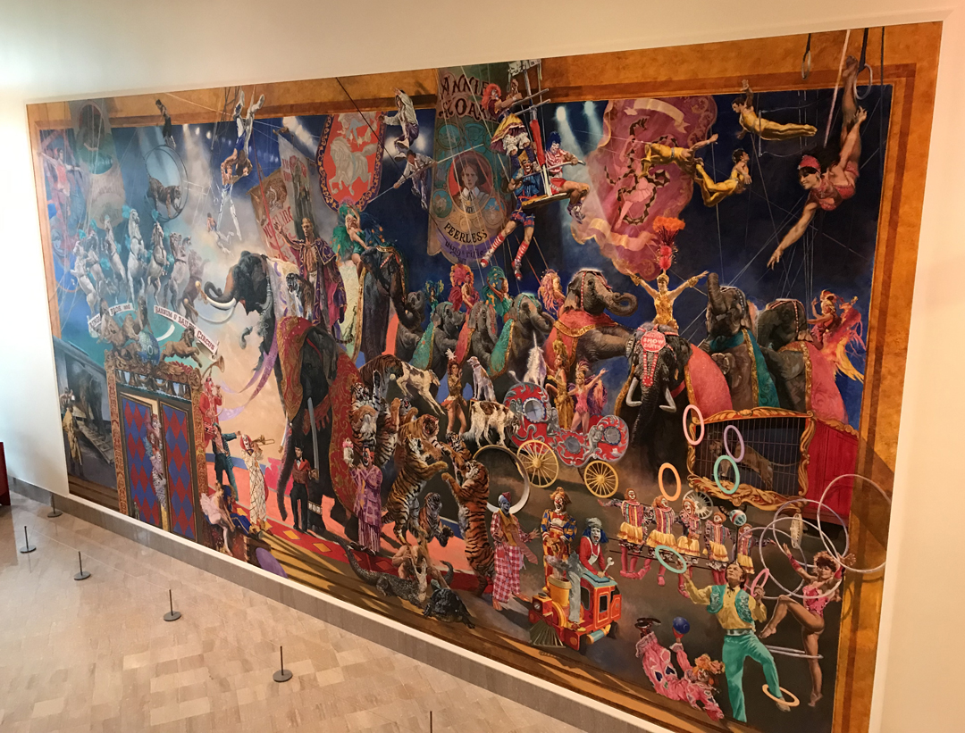 “Greatest Show on Earth” Mural – 42 x 22 feet, 45 specific performers, 45 animals, and 7 banners