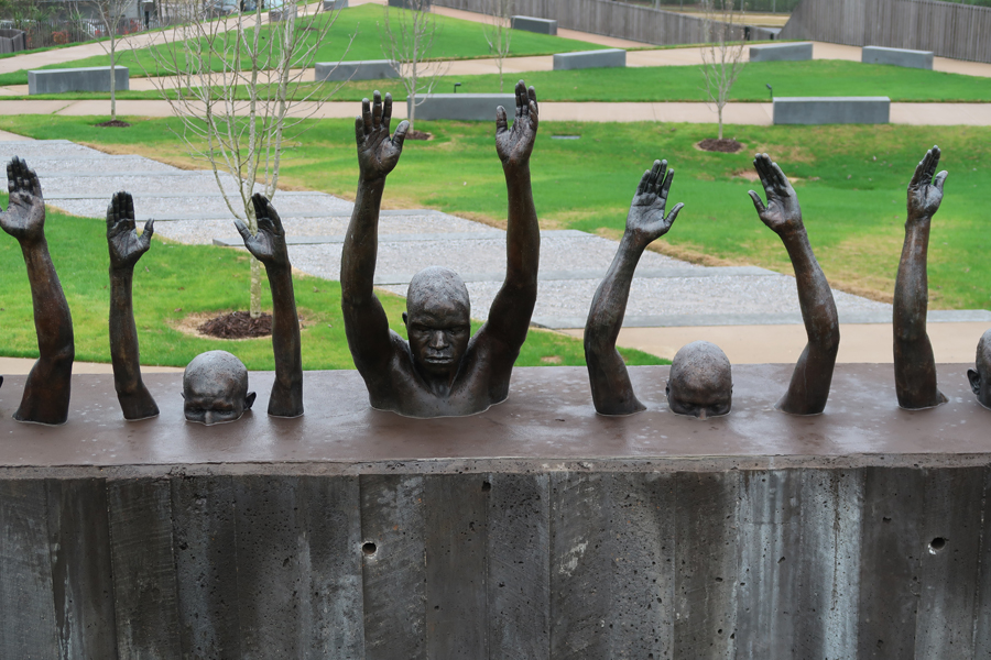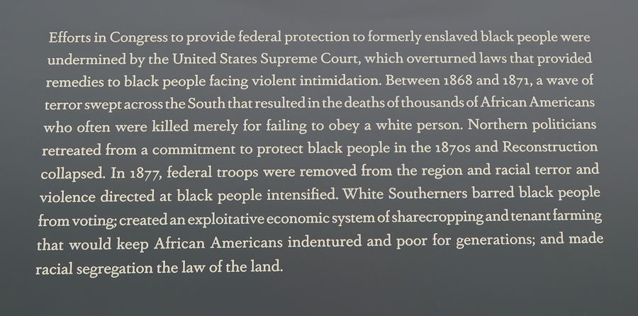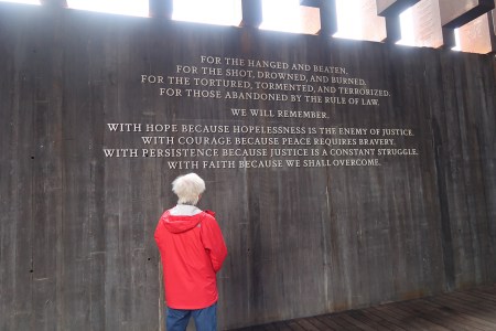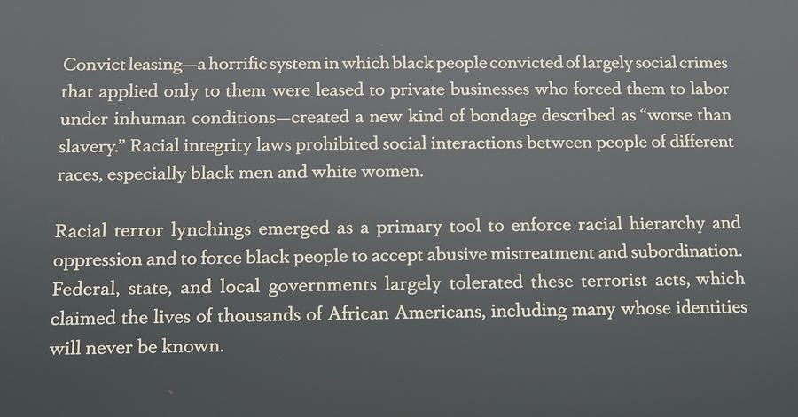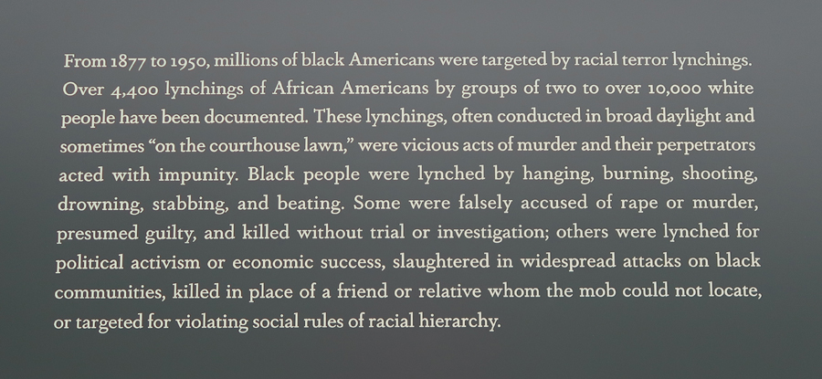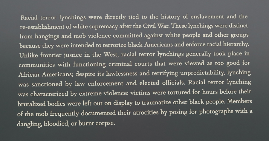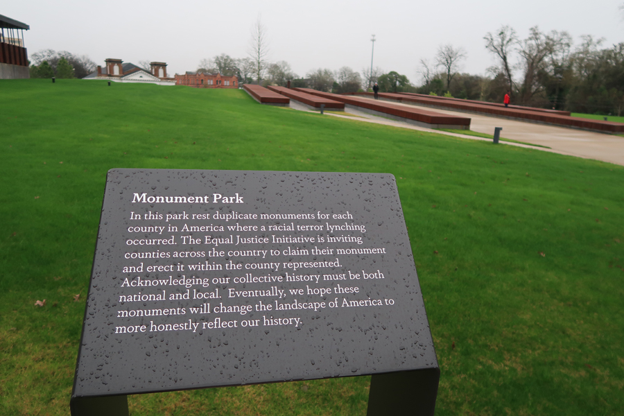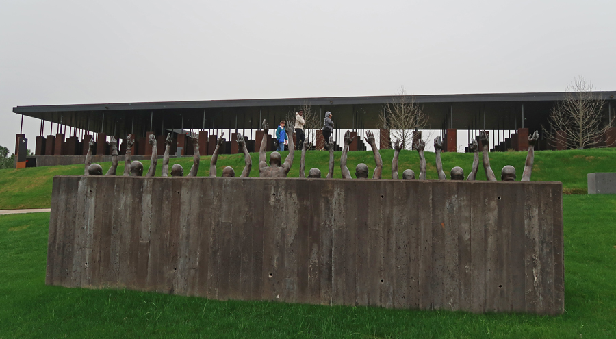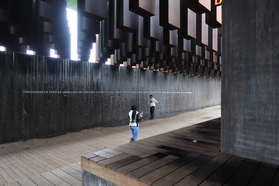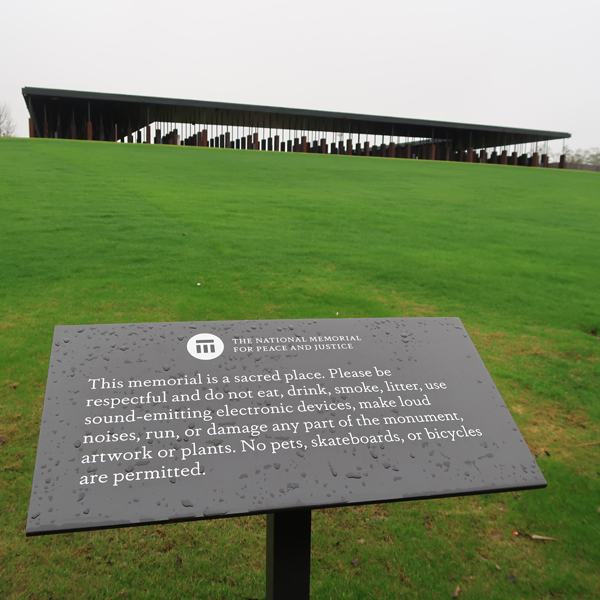 1/3 Th – We arrived at the National Memorial for Peace and Justice, also known as the National Lynching Memorial, just after it opened at 9am. This is a memorial to the more than 4400 African American men, women, and children who were hanged, burned alive, shot, drowned, and beaten to death by white mobs between 1877 and 1950. Mind you, there were many, many, more – these are the ones that have been documented! AND the number does not include those killed since 1950.