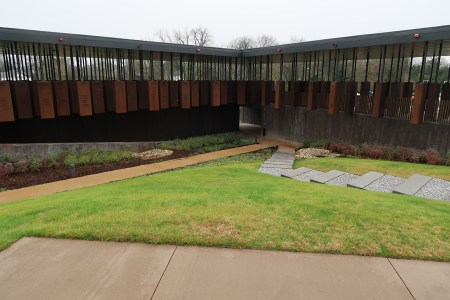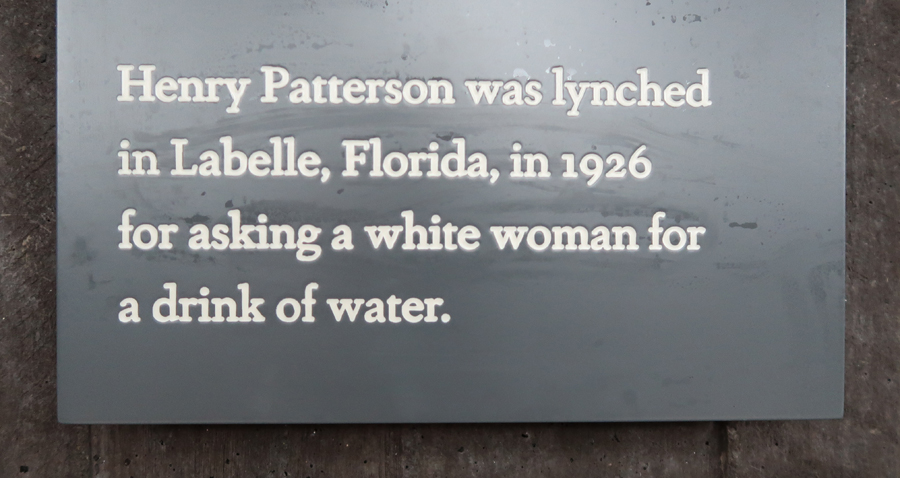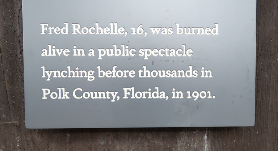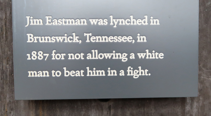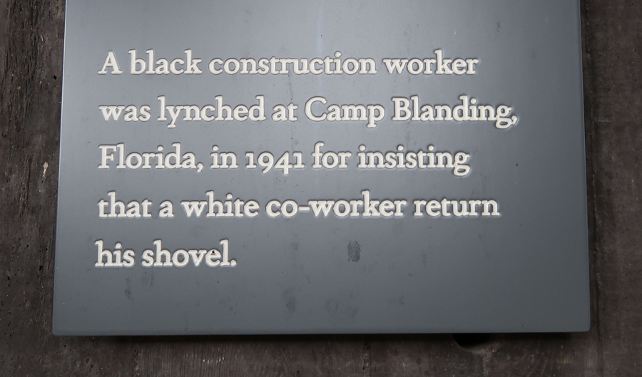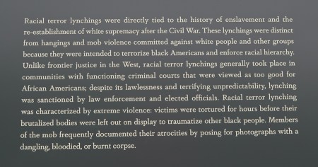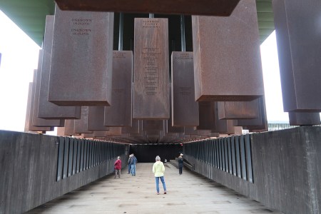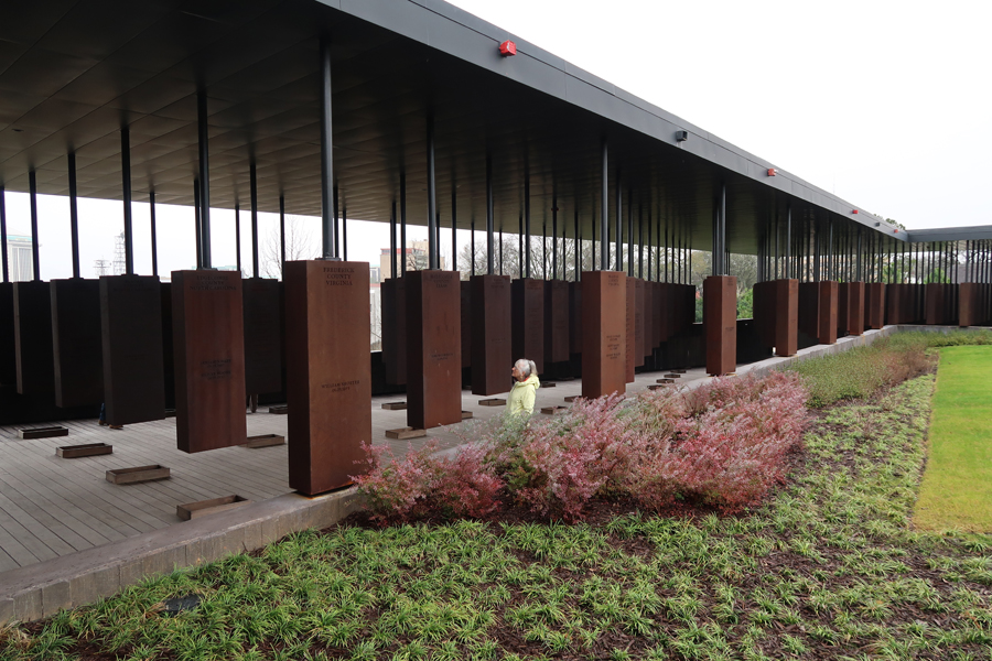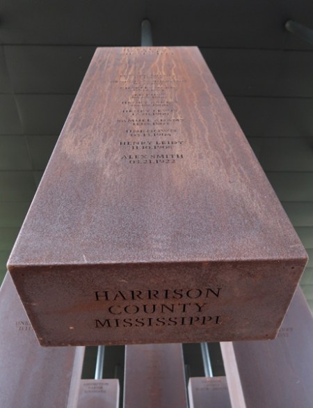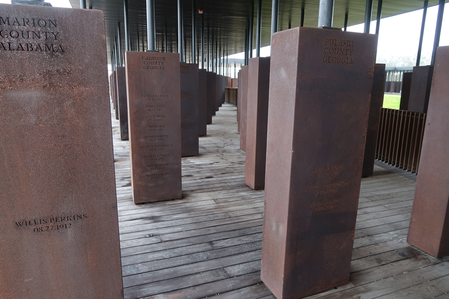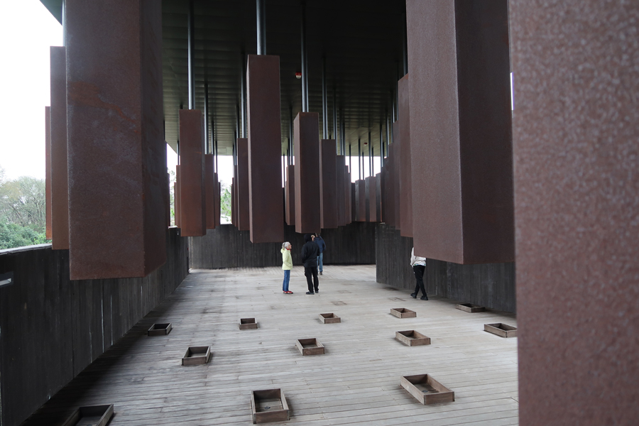 The structure contains over 800 steel monuments, one for each county in the U.S. where one or more racially related killings took place. The name(s) of the victim(s) is/are “engraved,” i.e. cut-through the steel. As you enter, the first side of the rectangle has the steel monuments hanging with the bottom just off the floor.