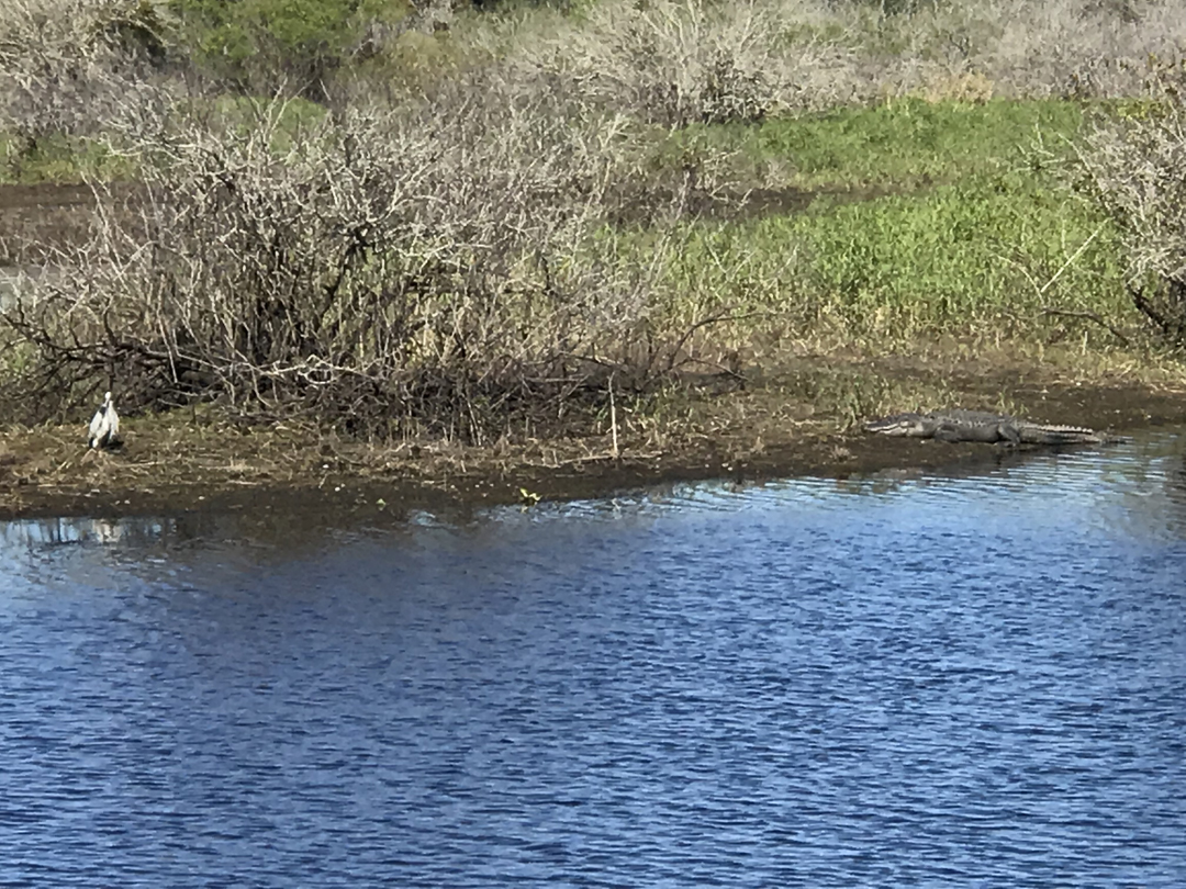 1/21 M – It took a half hour to drive to the north entrance to Myakka River State Park. The river flows through park wetlands, prairies, hammocks, pinelands, and two shallow lakes. Note alligator on right