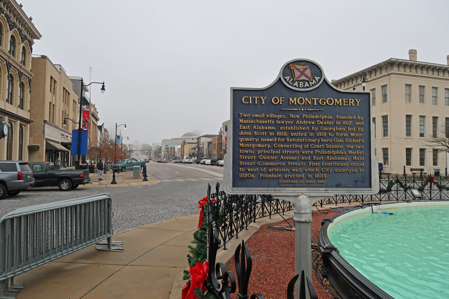Court Square Fountain, state capitol in background center at the end of Dexter Ave, one of several locations in Montgomery where thousands of slaves were bought and sold