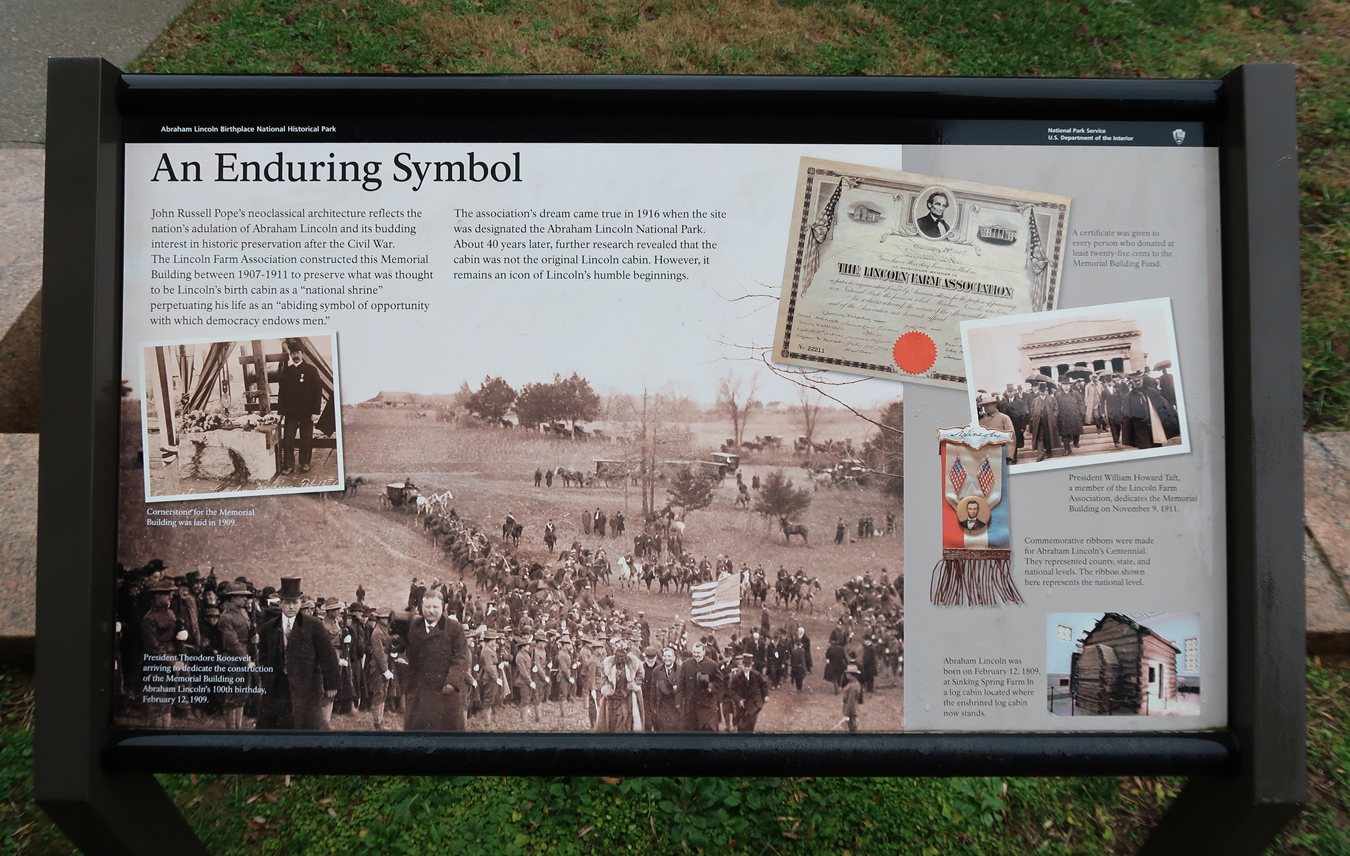 A wood cabin, originally thought to be the home of the Lincoln family, is inside the Memorial. Abraham Lincoln was born on 2/12/1809 in a log cabin here at Sinking Springs Farm.