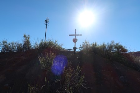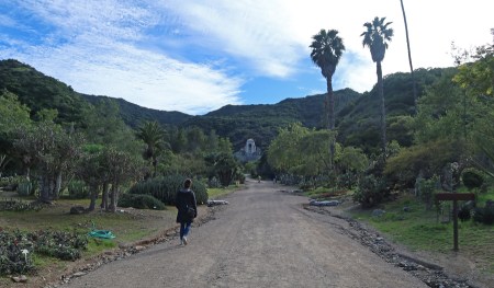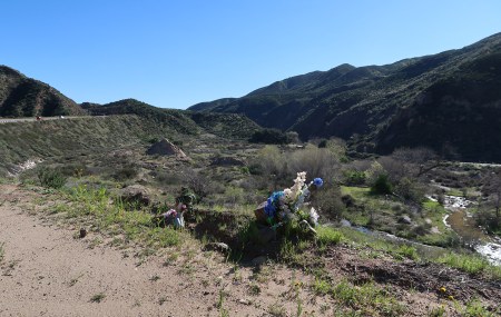 A bit further up the road is the old Francisquito Canyon Rd, which is now blocked off but can be hiked to the dam site. We continued past this point to where the old road re-joins the new road north of the dam site. We parked the car and started to walk down the old road toward the dam site but found it covered with water. I then drove back about a half mile to a point where I could access what remains of the earthen part of the Saint Francis Dam and parked along the road. The reservoir behind the 200-foot high concrete dam was part of the new Los Angeles Aqueduct system built to bring water 233 miles from Owens Valley on the east slope of the Sierra Nevada Mtns near Mono Lake to Los Angles. It had just filled when the dam burst sending a wall of water 54 miles down Francisquito Canyon and then the Santa Clara River to the Pacific Ocean. It is estimated that about 450 men, women, and children died as a result of this disaster. This is a view of the area, including parts of the dam, about a half mile downstream from the dam site – note the white crosses.