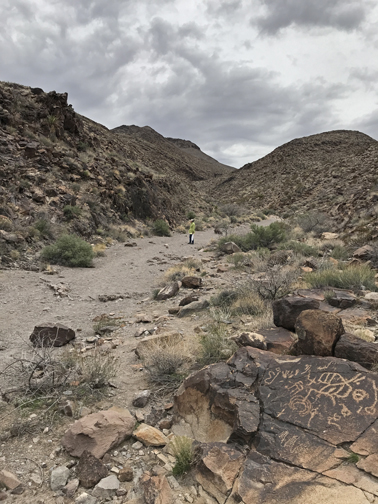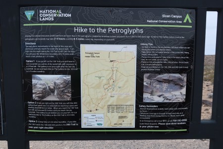 3/11 M – 4.5hrs from Silver Lake to Sloan Canyon National Conservation Area (NV) ~15 miles S of Las Vegas (I15 to Exit 25). It was difficult to find the access road because there was construction taking place for a very large housing development. When we arrived at the trailer Visitor Contact Station, we found it closed, though it was supposed to be open.