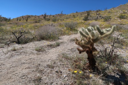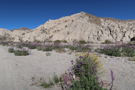 Our last stop was in Coachwhip Canyon. After we had driven as far as we could on the 4WD road, we were rewarded with blooms of Arizona Lupine and yellow Brittlebush