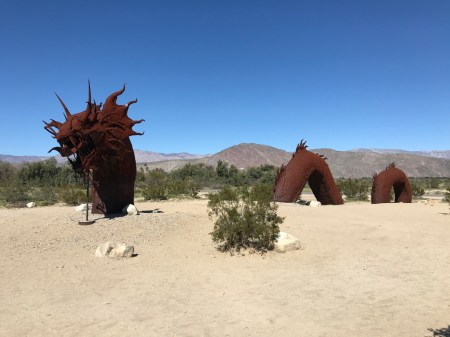 There were metal sculptures in the desert all around Borrego Springs – camels, horses, elephants, dragons, etc. The tourists were as interested in these as the wildflowers – lots of folks out taking pictures. Fossils of Columbian Mammoths have been found in here.