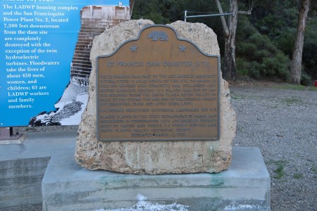A little further up the road is the site of San Francisquito Power House No. 2 where there is additional information on the disaster. This Power House was 1.4 miles below the dam and was destroyed when the dam burst on March 12, 1928.