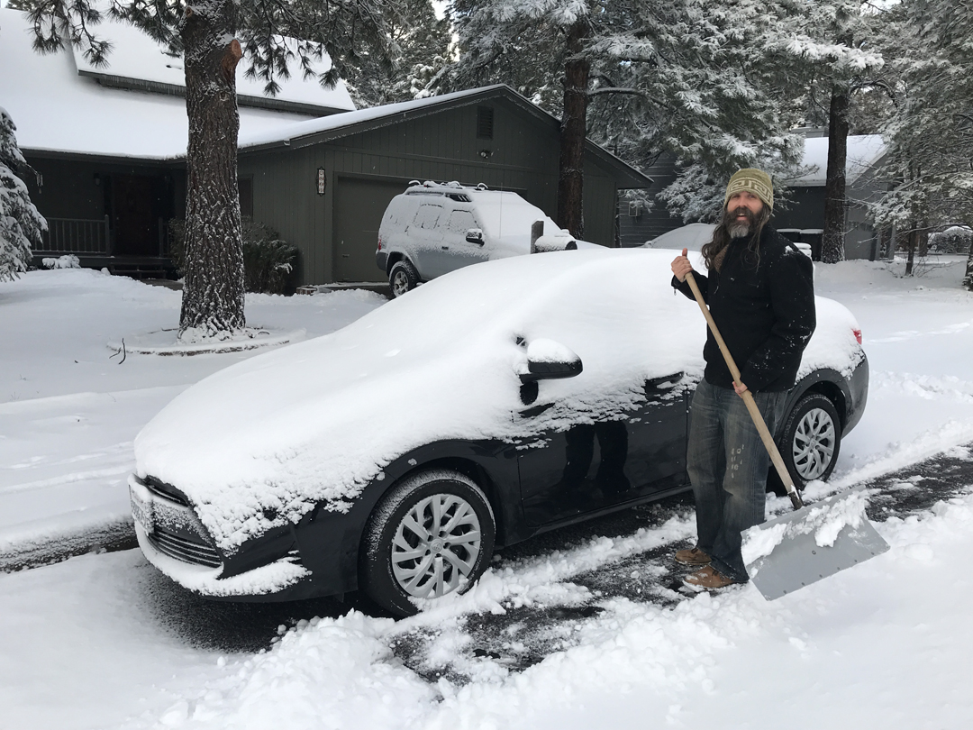 3/13 W – woke to 3 inches of snow and more coming down. We had an organic breakfast and then Chris shoveled a path in the snow to our car.