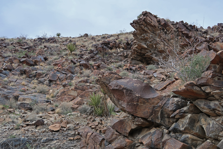 3/11 M – 4.5hrs from Silver Lake to Sloan Canyon National Conservation Area (NV) ~15 miles S of Las Vegas (I15 to Exit 25). It was difficult to find the access road because there was construction taking place for a very large housing development. When we arrived at the trailer Visitor Contact Station, we found it closed, though it was supposed to be open.