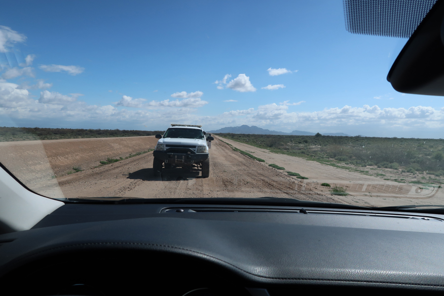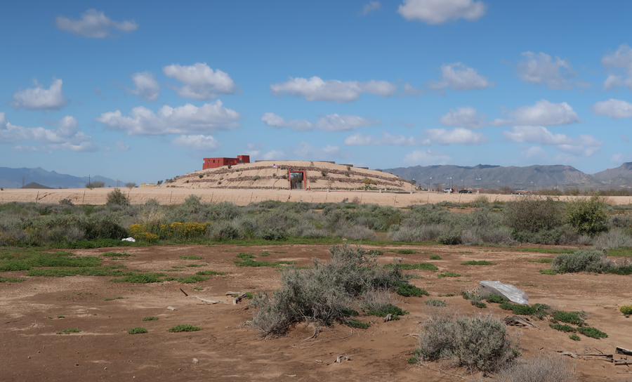 The first half of the drive to Phoenix was slow due to the weather. We passed through Phoenix and then I followed a map I had found to Hohokam Pima National Monument. We exited I17 south of Phoenix. I then followed dirt roads until I was unable to go any further toward the location on the map. I decided to walk to the location. Helen did not want to go, so she stayed in the car and cross-stitched. I found the location a short distance away. The village known as “Snaketown” was excavated in the 1930s and again in the 1960s. After the last excavation it was completely covered. The monument is on the Gila River Indian Reservation. As I walked back to the car, I saw there was a police car next to my rental. As I approached, a second police car arrived.