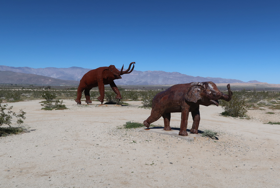 There were metal sculptures in the desert all around Borrego Springs – camels, horses, elephants, dragons, etc. The tourists were as interested in these as the wildflowers – lots of folks out taking pictures. Fossils of Columbian Mammoths have been found in here.