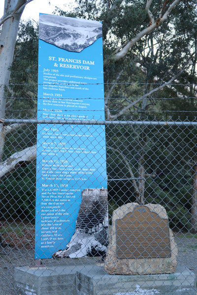 A little further up the road is the site of San Francisquito Power House No. 2 where there is additional information on the disaster. This Power House was 1.4 miles below the dam and was destroyed when the dam burst on March 12, 1928.