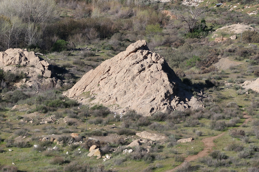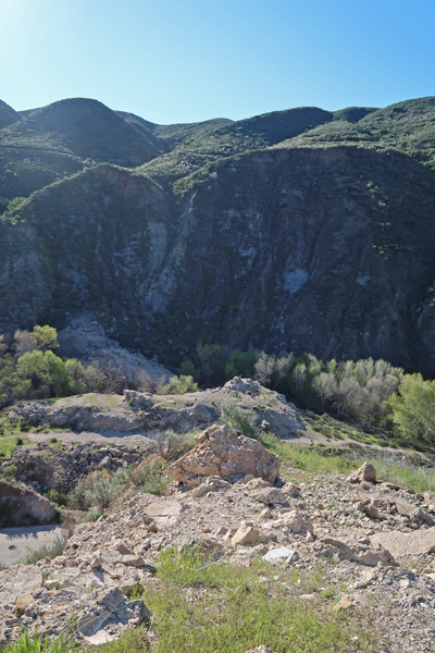 A bit further up the road is the old Francisquito Canyon Rd, which is now blocked off but can be hiked to the dam site. We continued past this point to where the old road re-joins the new road north of the dam site. We parked the car and started to walk down the old road toward the dam site but found it covered with water. I then drove back about a half mile to a point where I could access what remains of the earthen part of the Saint Francis Dam and parked along the road. The reservoir behind the 200-foot high concrete dam was part of the new Los Angeles Aqueduct system built to bring water 233 miles from Owens Valley on the east slope of the Sierra Nevada Mtns near Mono Lake to Los Angles. It had just filled when the dam burst sending a wall of water 54 miles down Francisquito Canyon and then the Santa Clara River to the Pacific Ocean. It is estimated that about 450 men, women, and children died as a result of this disaster. This is a view of the area, including parts of the dam, about a half mile downstream from the dam site – note the white crosses.