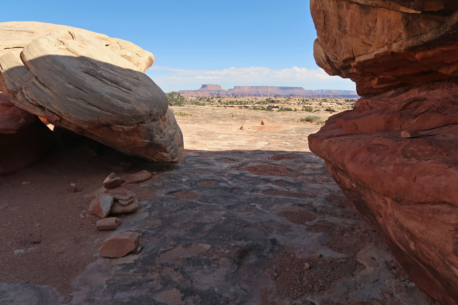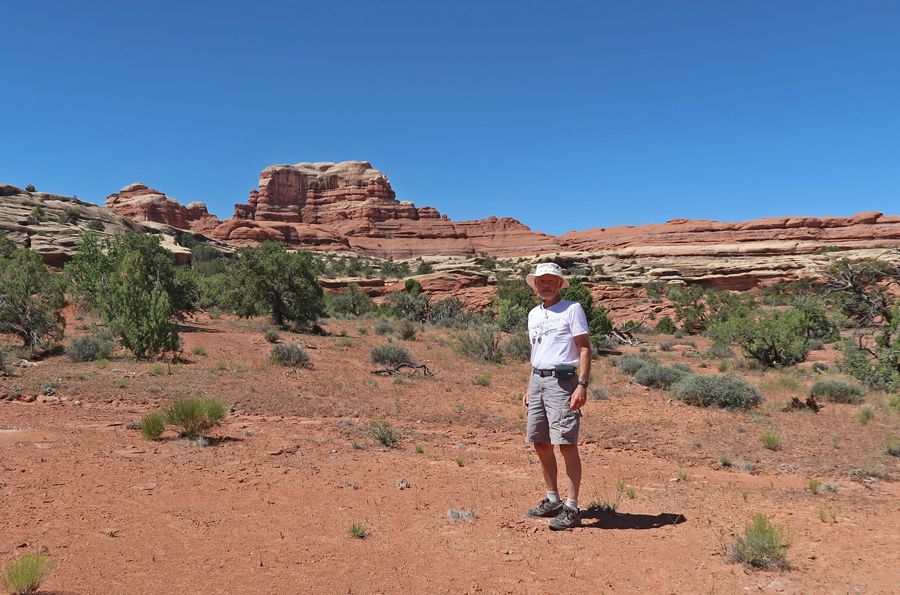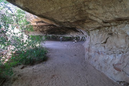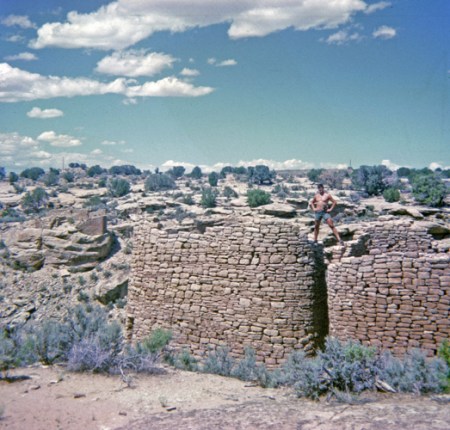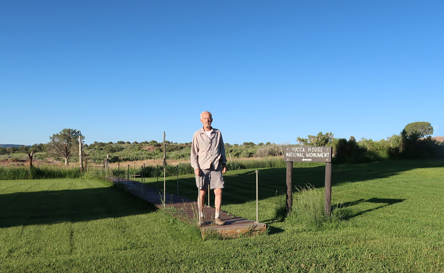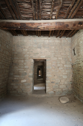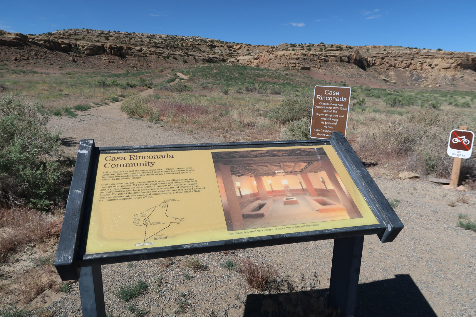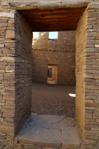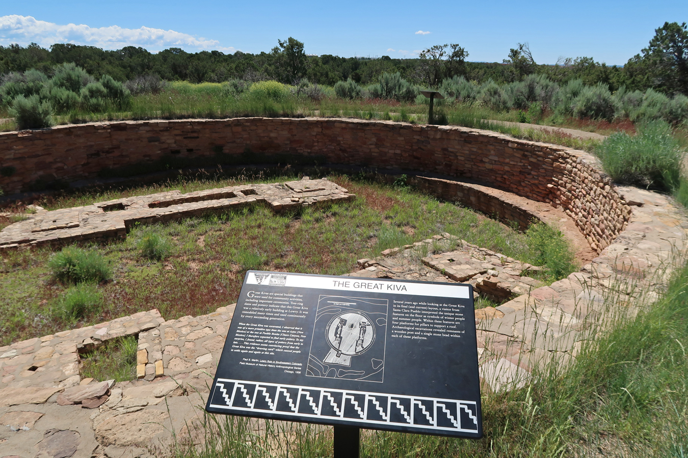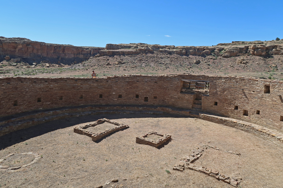 It was a short walk to the Great Kiva – the largest excavated kiva in the park. I found a young man there who was doing his PhD dissertation on the roads that led into the canyon and the Great Kiva. He stated that, from 800 to 1100, many well-constructed major roads extended hundreds of miles from this religious center. He pointed out how, on the summer equinox, the sun shines through a specific window of this kiva casting light on a specific alcove on the inside wall. The square formed by the four large columns that held up the roof are constructed precisely so it has north, south, east, and west sides.