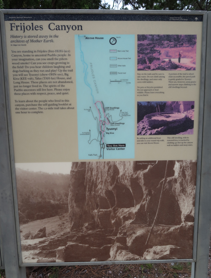 1.5hrs to Bandelier National Monument – As I was passing Santa Fe, I saw signs for Bandelier NM, which was right on my route. So, I decided to go. This was my second visit; first visit was 1982. I discovered I had to take a 20min shuttle into the monument from White Rock. Well, I just missed one, so had to wait 20min for the next one. As soon as I arrived at the Visitor Center, I picked up the monument brochure and stamped it with today’s date.