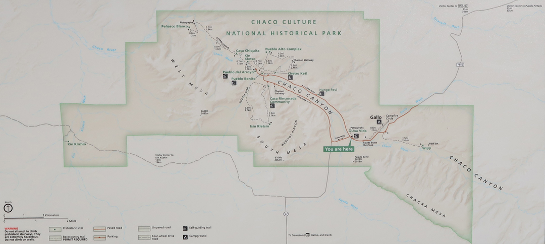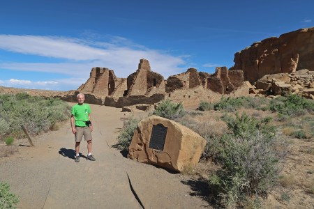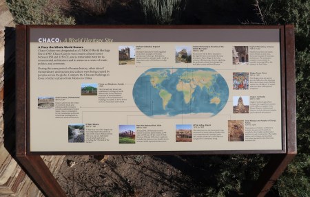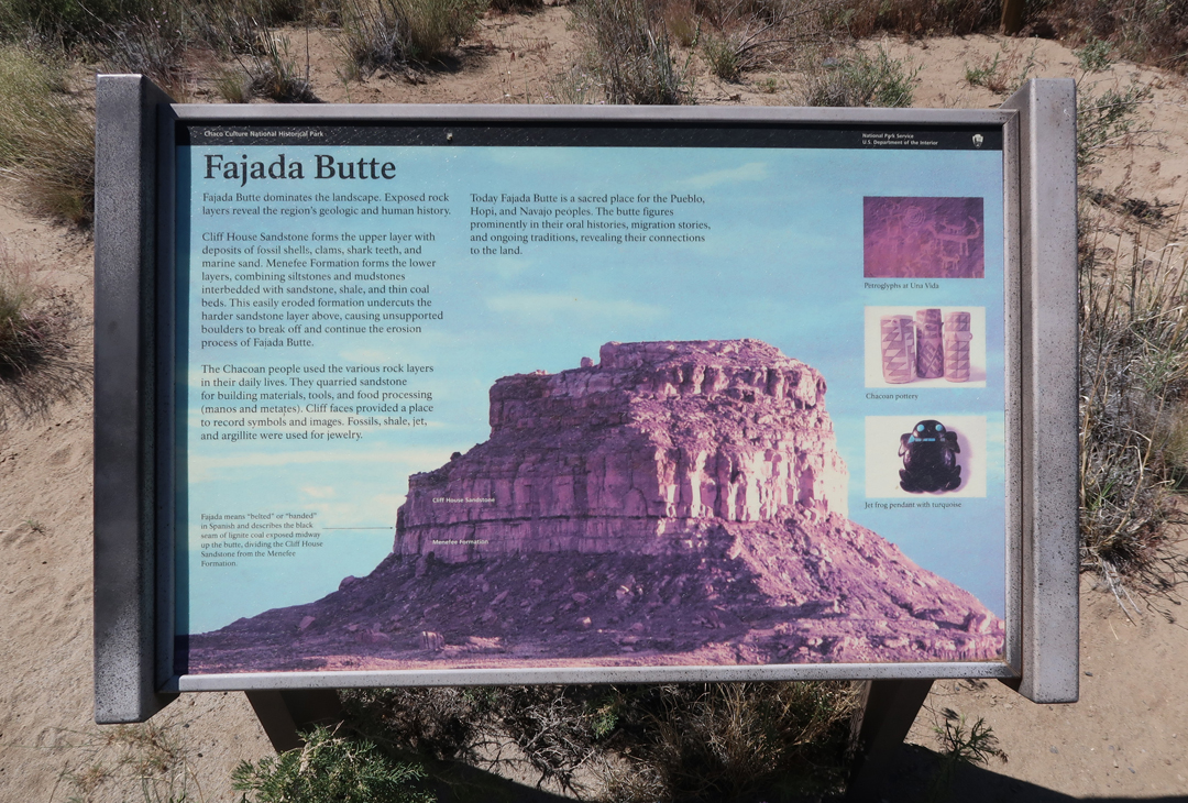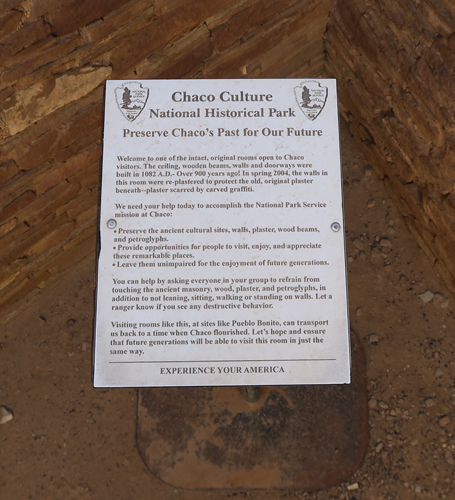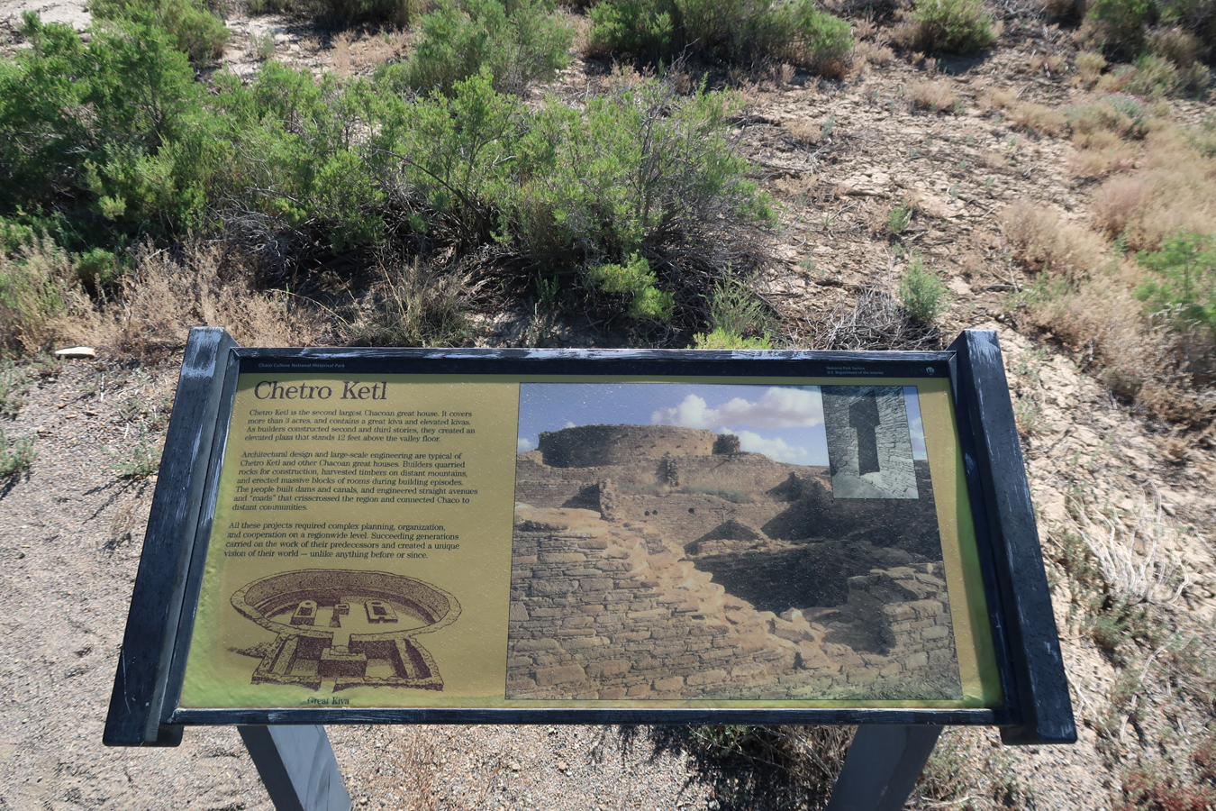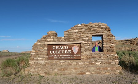 3.5hrs to Chaco Culture National Historical Park, Rt7950 that enters the park from the NE and is poorly maintained. It is a terrible “washboard” road; so, you bump your way into the park! Canyon was central to thousands of people between 850 and 1250 A.D. It was good to tour in the morning before it got too hot.