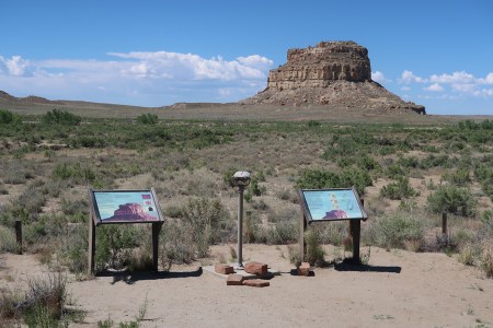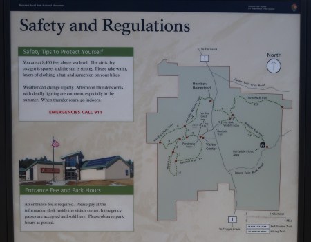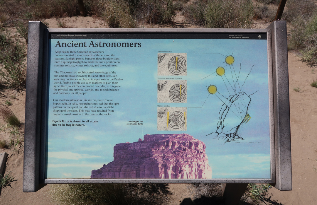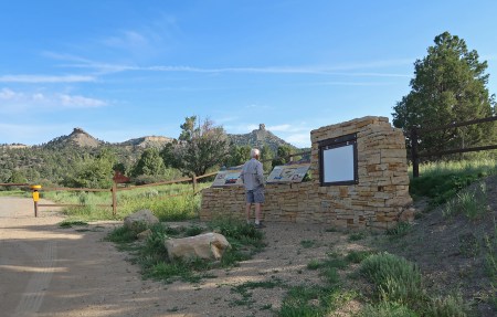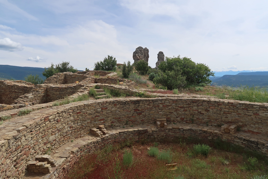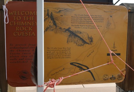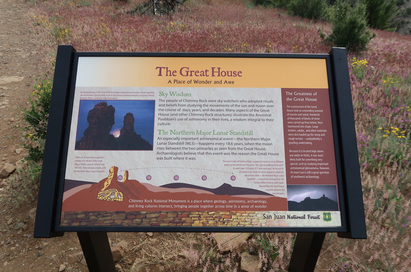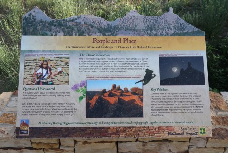 There were two nice displays at the entrance gate. Designated in 2012 by President Barack Obama, making it the seventh national monument managed by the USDA Forest Service. The Chimney Rock National Monument encompasses 4,726 acres of the San Juan National Forest between Durango and Pagosa Springs, Colorado. Chimney Rock represents one of the largest Pueblo II (900-1150 AD) communities in southwestern Colorado and is considered a Chacoan cultural “outlier.” The Chaco phenomenon was a complex system of dispersed communities bound by economic, political and religious interdependence centered in Chaco Canyon, New Mexico. The pinnacles that give Chimney Rock its name frame multiple astronomical alignments. The Ancestral Puebloans incorporated their knowledge of astronomy into the design of their community. Today Chimney Rock is one of the best recognized archaeo-astronomical resources in North America, with alignments with the northern lunar standstill, summer solstice, equinoxes and Crab Nebula. Chimney Rock preserves 200 ancient homes and ceremonial buildings, some of which have been excavated for viewing and exploration: a Great Kiva, a Pit House, a Multi-Family Dwelling, and a Chacoan-style Great House Pueblo. Chimney Rock is the highest in elevation of all the Chacoan sites, at about 7,400 feet above sea level.