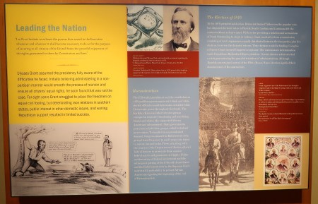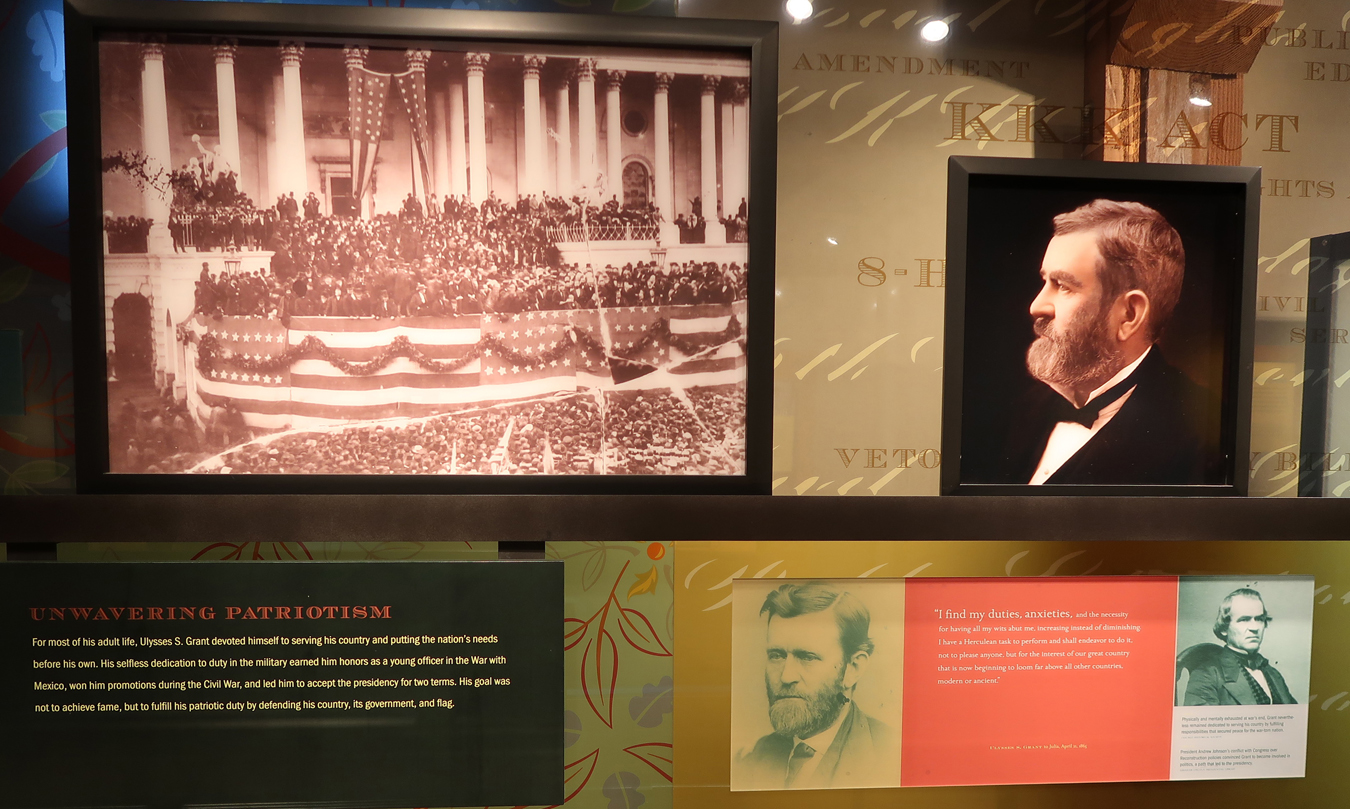 Hiram Ulysses Grant (1822-1885) was born in Point Pleasant Ohio. Julia Boggs Dent was born in 1826 and grew up at White Haven. She married Grant in 1848 after the Mexican-American War and they had four children. Grant’s abolitionist father Jesse, who disapproved of the Dents owning slaves, refused to attend their wedding, which took place without either of Grant’s parents. However, Julia was warmly received by Grant’s family in Bethel Ohio a month after their wedding. Grant continued in the Army with a variety of assignments but had long separations from his family. He resigned his position in the Army in 1854 after he was found “under the influence.” He had a previous episode of drunkenness and had told his commander that, if it happened again, he would resign. The Grants had received 80 acres across the road from White Haven as a wedding present from Julia’s father. Ulysses returned to White Haven, managed the estate and farmed his land across the road. He built a log cabin on the property (1855-56). They called it “Hardscrabble.” He tried many jobs/businesses in addition to farming but was not successful. In 1860, he took a position in his father’s leather goods business in Galena IL and in a few months paid off all his debts. Grant rejoined the Army in 1861 shortly after the start of the Civil War. In 1866, after the war, Congress promoted him to the newly created rank of General of the Army of the United States. Grant worked under President Andrew Johnson, who took office after Lincoln was assassinated, but was a political opponent. Grant accepted the nomination for President of the U.S. in 1866 and served for two terms (1869-1877).