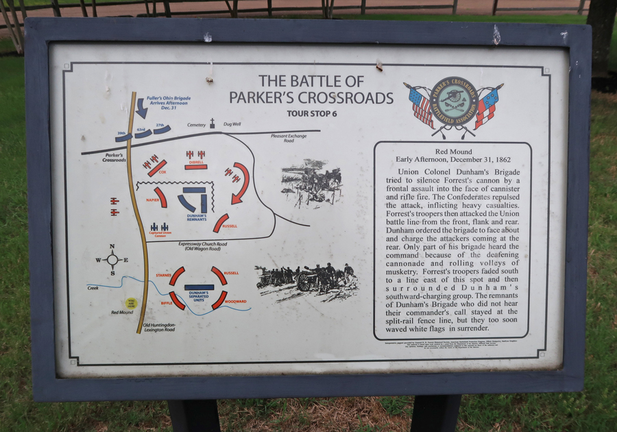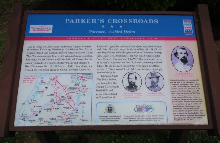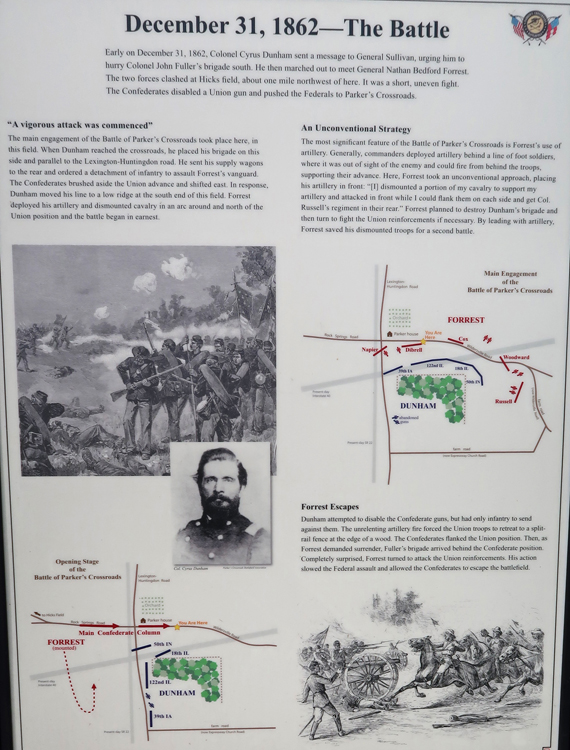 In late 1862, Confederate Brig. Gen. Nathan Bedford Forrest’s cavalry campaign (1800 men) in Western TN had been successful in harassing Union forces, destroying railroads, and disrupting communications. When Forest reached Parker’s Cross Roads on December 31st, a part of Brig. Gen Jeremiah C. Sullivan’s (3000 men) Union forces under Col. Cyrus Dunham tried to cut Forest off from retreating back across the Tennessee River. Forest successfully attacked Dunham and demanded an unconditional surrender, Dunham refused.
