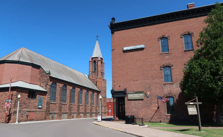 The former St Anne’s (Roman Catholic-French Canadian) church is now the Keweenaw Heritage Center. The Keweenaw NHP Visitor Center is located in the Union Building on the right, a former lodge hall for various fraternal organizations.