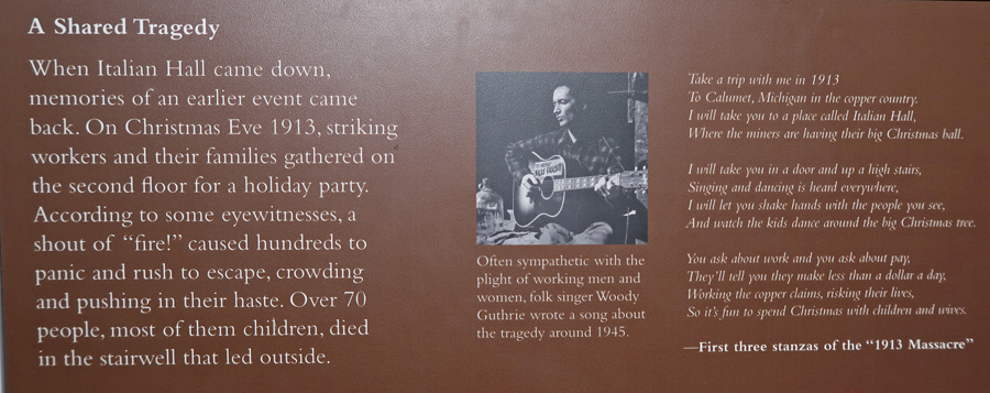 Woody Guthrie wrote a song titled the “1913 Massacre” about a fire that killed over 70, mostly children, that was suspected to have been set by company hires during the strike.