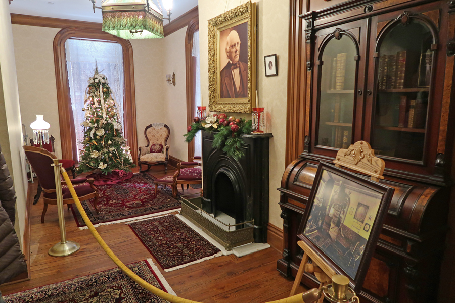 James Saxton’s portrait is on the left. The home was decorated for the Christmas holidays.