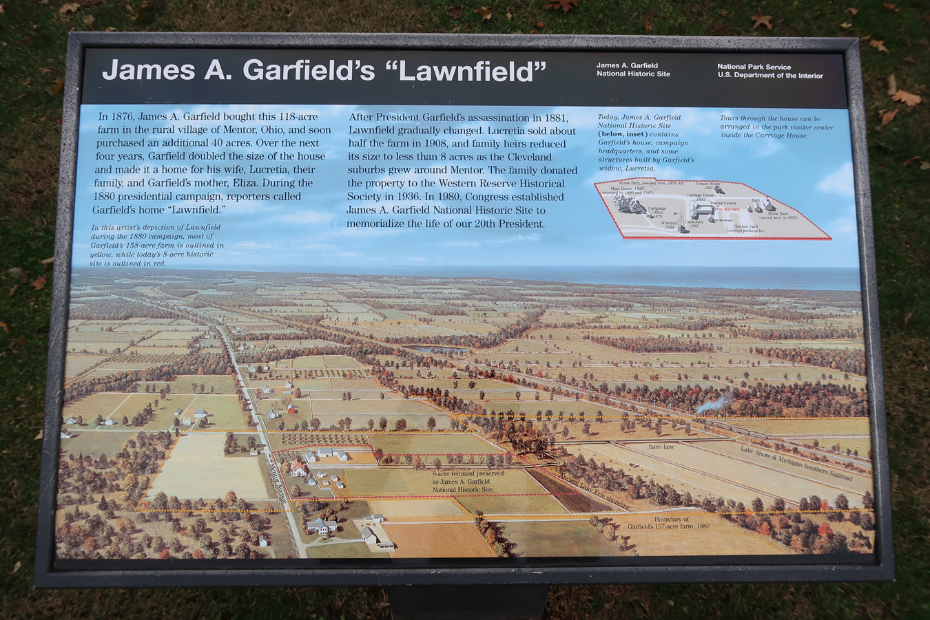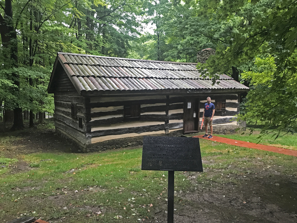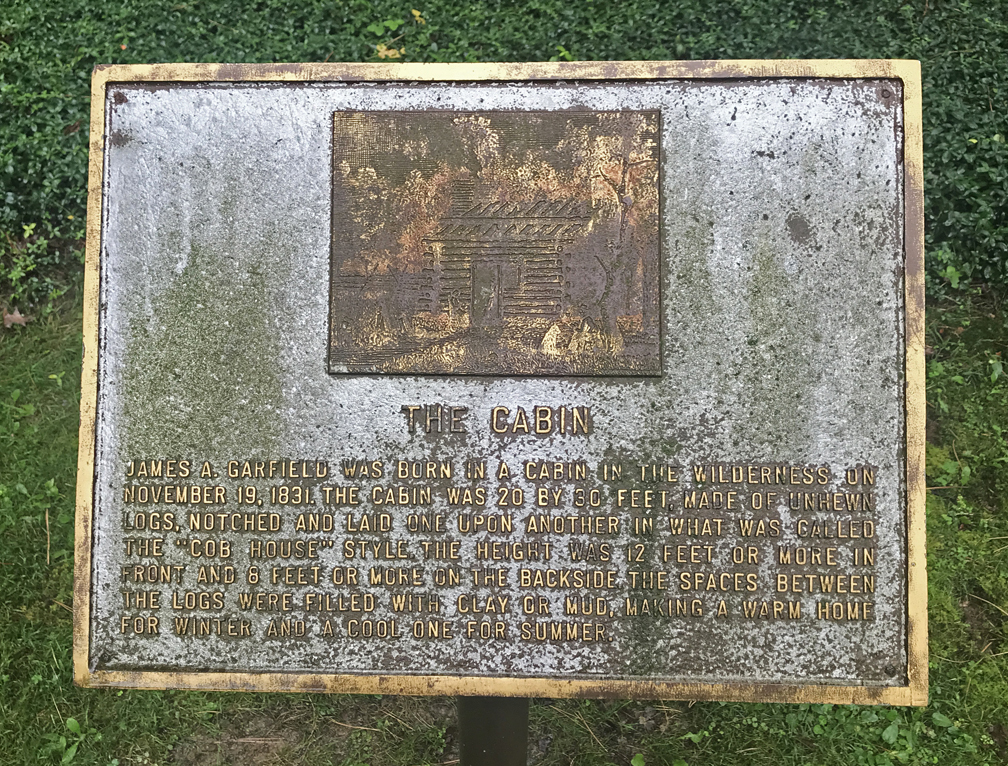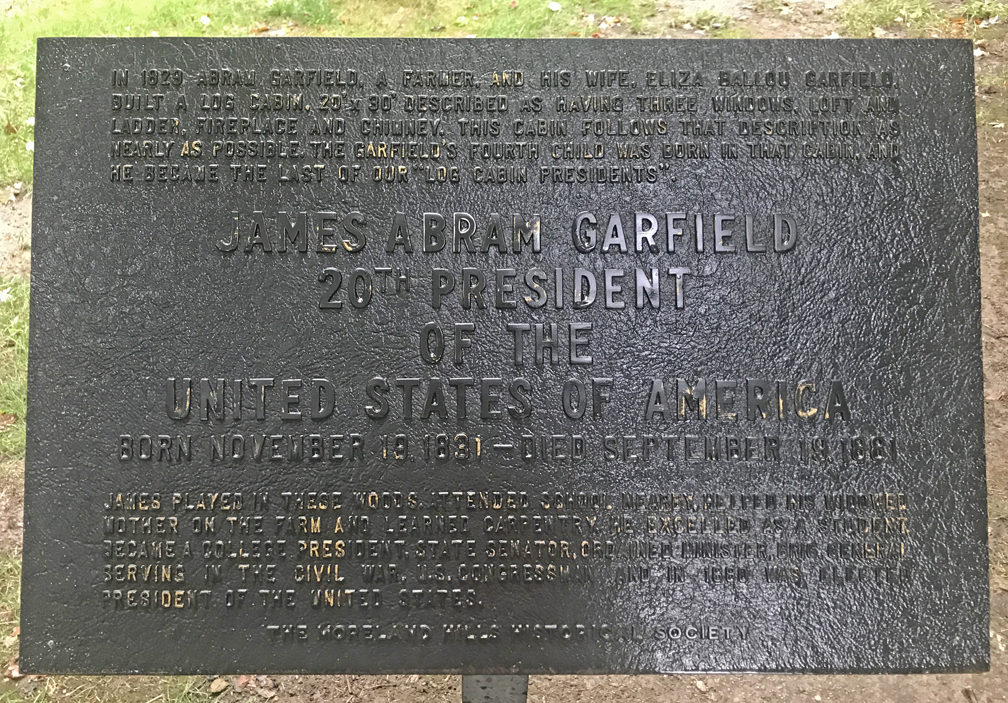 August 12, 2021, visit to Garfield’s birth site. Garfield was born in a log cabin in the wilderness frontier of Ohio’s Western Reserve in 1831. The site and a replica cabin are administered by the Moreland Hills Historical Society (Cleveland suburb).