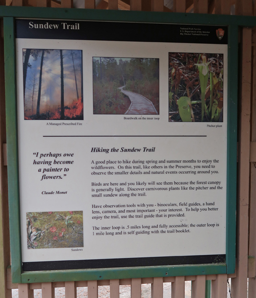 John and I hiked three trails in the Preserve. The first was the Sundew Trail. We did the one-mile outer loop.