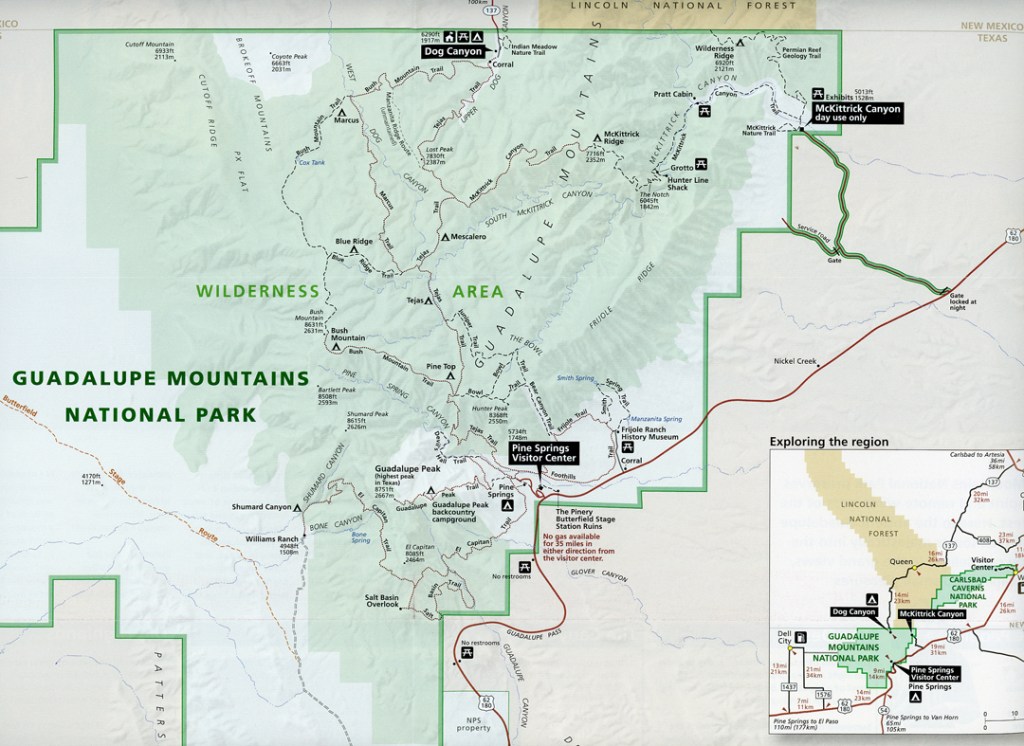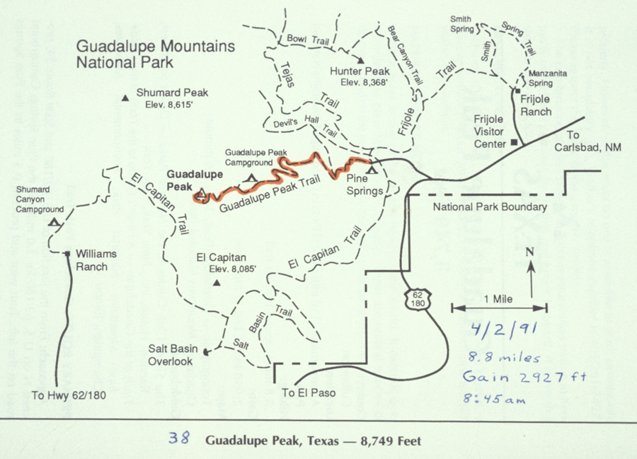 My first visit to Guadalupe Mountains NP was in 1991 when I climbed Guadalupe Peak (8,751ft), the highest point in TX. I did an early morning 8.8-mile hike (elevation gain of 2,927ft) in windy conditions. High winds coming off the desert are common for this peak.