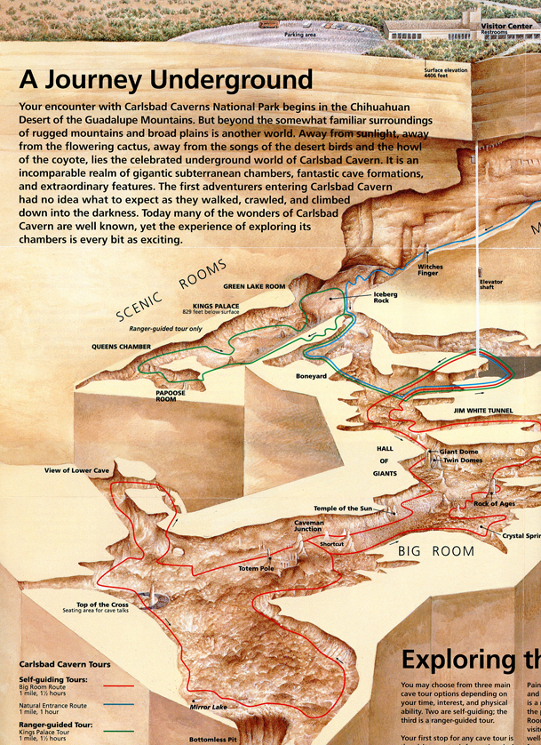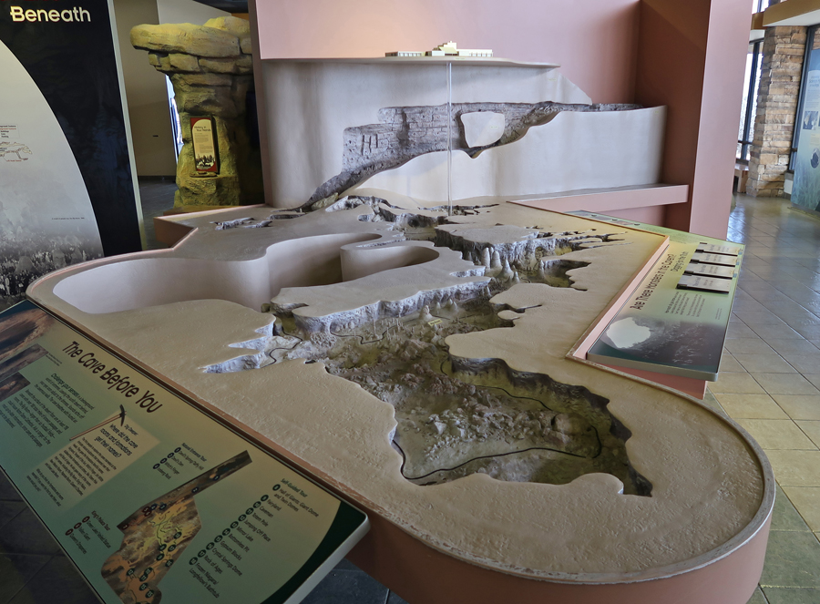 Model showing descent from Natural Entrance, Big Room, and elevator to Visitor Center.