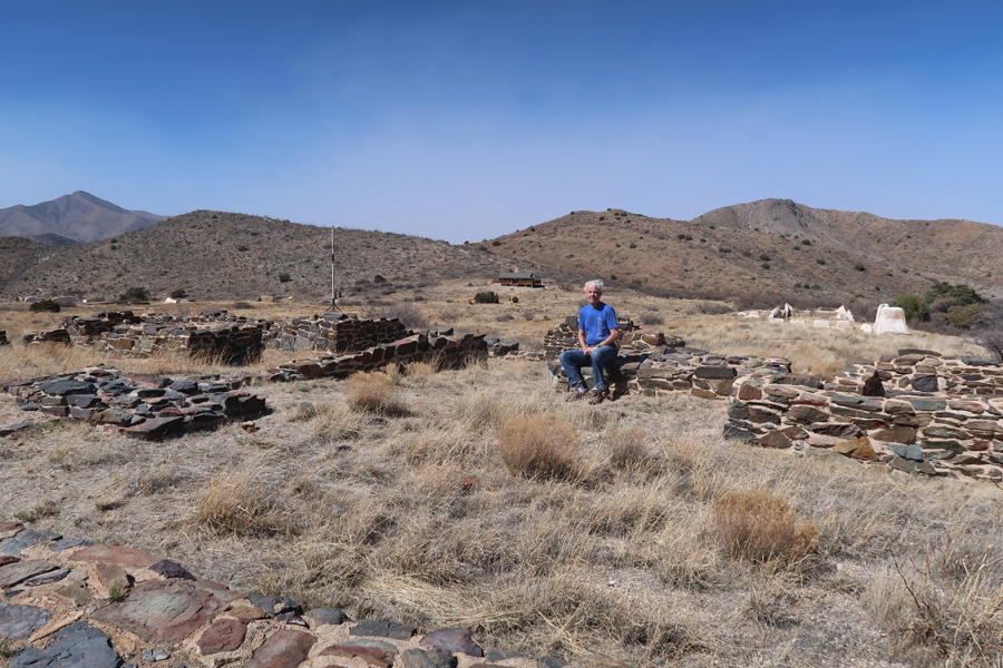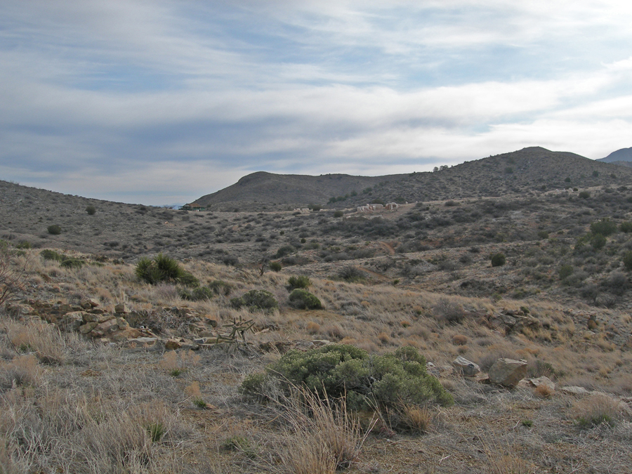 School Foundation, Parade Grounds (flagpole), and Second Fort Bowie Infantry barracks ruin in distance (white)