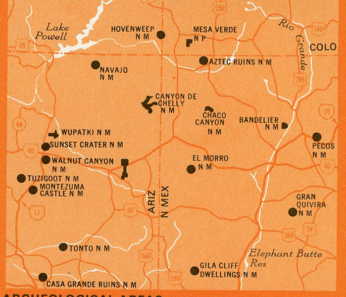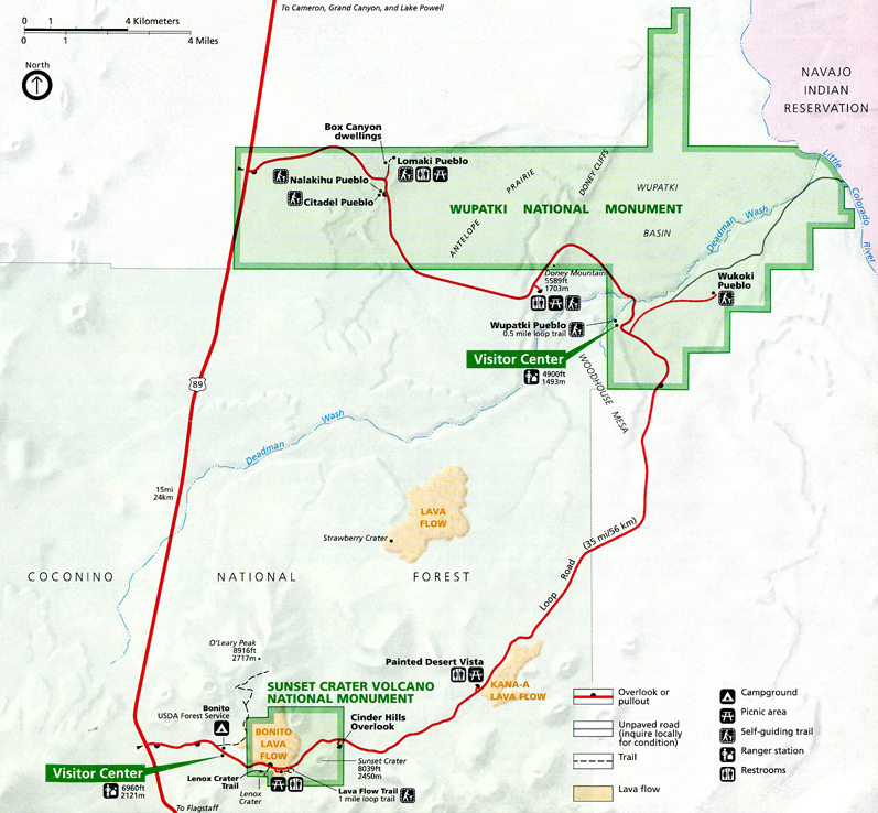 See the previous map for Sunset Crater and Wupatki NMs. I did the short walks to the six major pueblo ruins in Wupatki NM. This was a repeat of previous visits in 1966 and 1998.