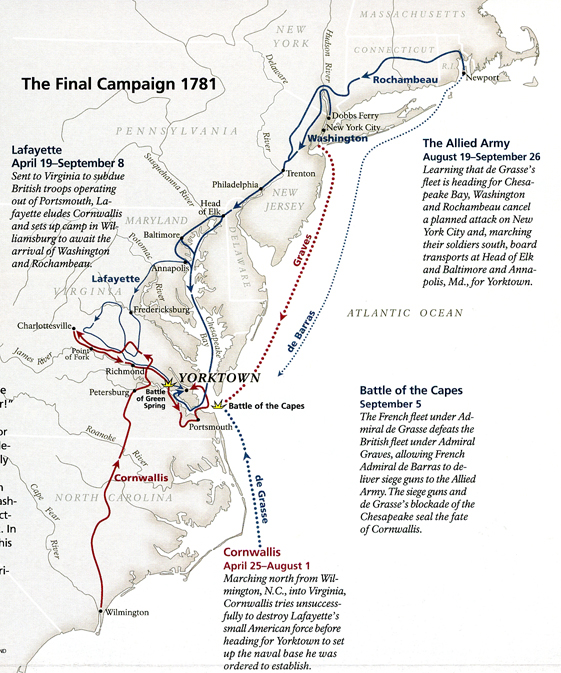 There is also a monument here to French Admiral Comte de Grasse, who defeated the English fleet on September 5, 1781, in the “Battle of the Capes.” This prevented reinforcements from reaching Lord Cornwallis in Yorktown, leading to his surrender on October 19th. Britain recognized American Independence in January 1783.