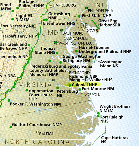 The Colonial Parkway is a leisurely (40min) and scenic way of traveling between the Jamestown Settlement and the Yorktown Battlefield of the Revolutionary War.