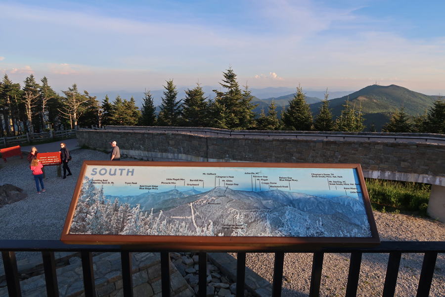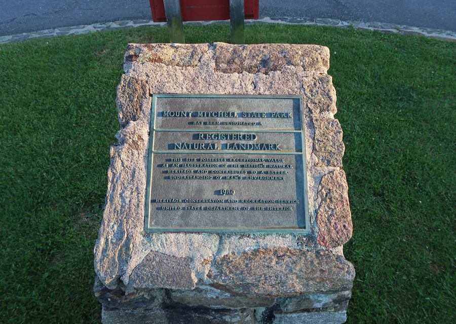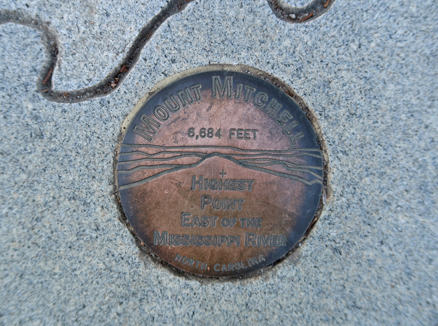In 1915, high winds destroyed the obelisk and a 15-foot ladder, supported by three poles was placed on the summit. When Mount Mitchell State Park was created in 1916, a 15-foot covered wooden platform was constructed. In 1926, NC replaced the platform with a medieval looking stone tower. In 1928, a funeral cairn and plaque was placed on Mitchell’s grave. The word “University” is misspelled on the plaque! In 1959, a viewing platform was constructed on the 25-foot stone tower.