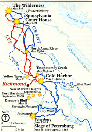 General Ulysses S. Grant’s 1864 Overland Campaign (see Blog for April 2017) began with the Battle of the Wilderness May 5-6, followed by the Battle of Spotsylvania May 8-21, and reached the outskirts of Richmond at the end of May. At Cold Harbor, 6,000 Federals were killed or wounded during massive, ill-conceived, assaults on Confederate entrenchments. Most of the casualties took place in one hour! The Civil War in the East was changed from a war of maneuver to one of siege.
