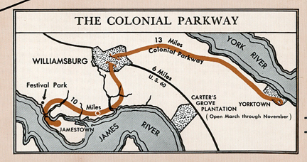 The Colonial Parkway is a leisurely (40min) and scenic way of traveling between the Jamestown Settlement and the Yorktown Battlefield of the Revolutionary War.