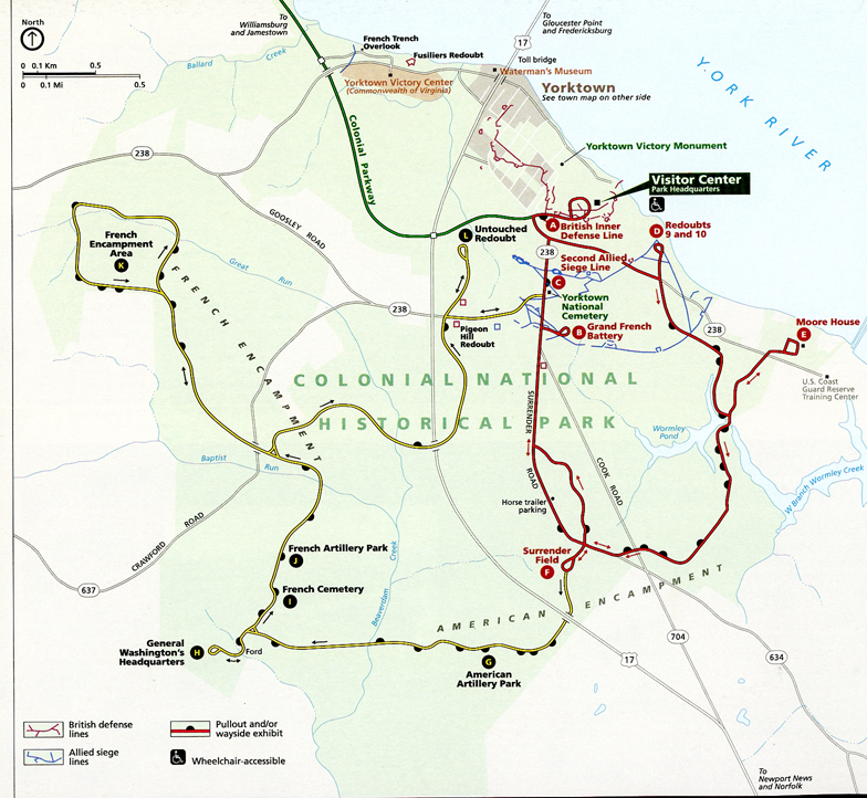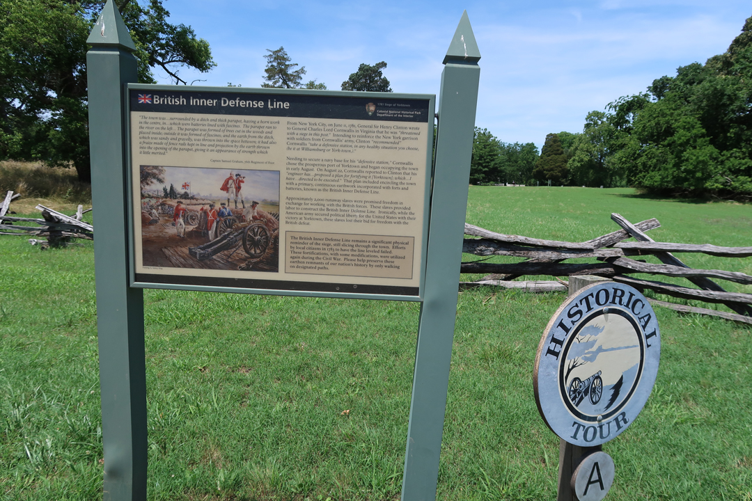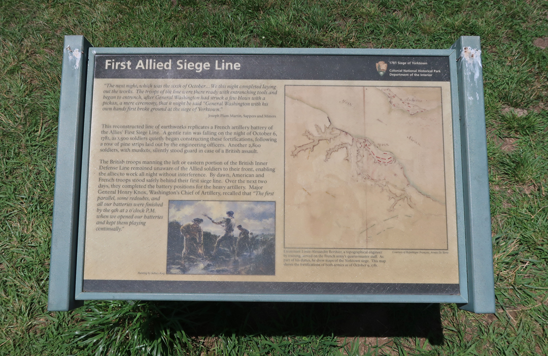 This sign, a short distance from the NP Visitor Center is close to Yorktown and is the first stop on a 7-mile loop road that takes you through the British inner Defense Line and the Allied (American and French) siege lines.