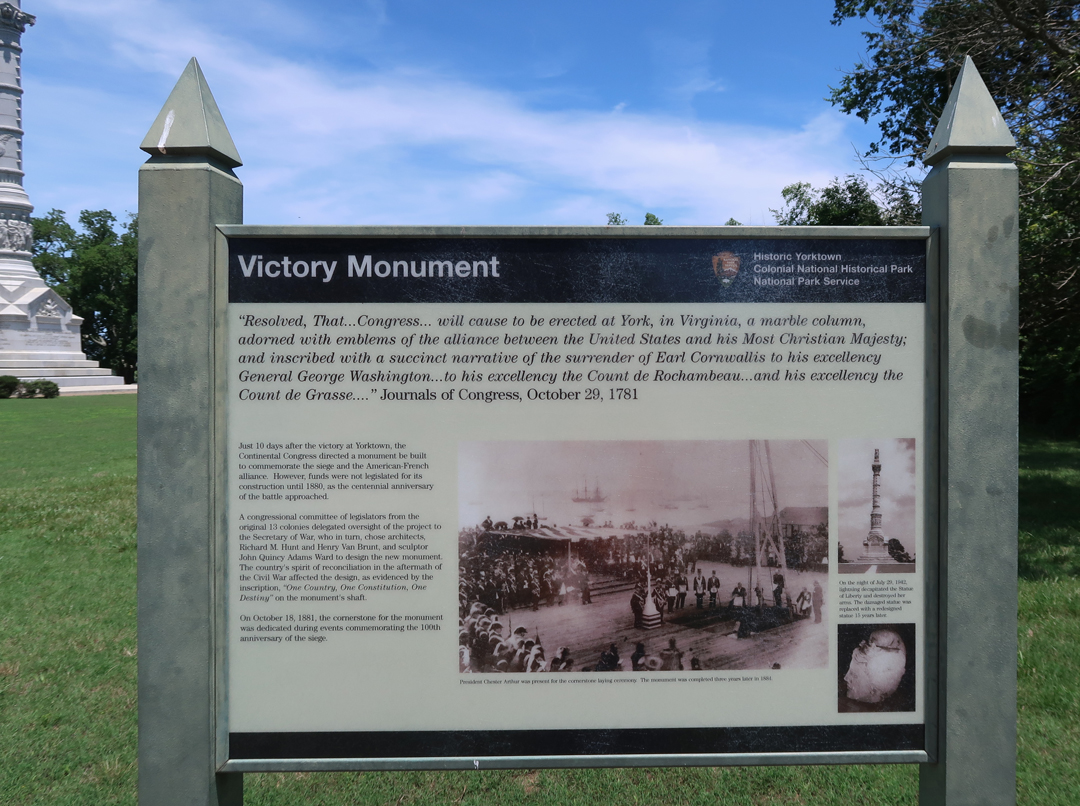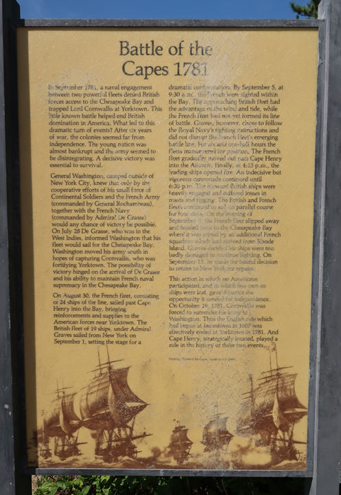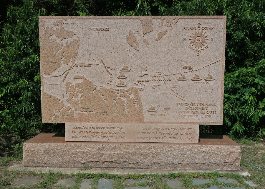 There is also a monument here to French Admiral Comte de Grasse, who defeated the English fleet on September 5, 1781, in the “Battle of the Capes.” This prevented reinforcements from reaching Lord Cornwallis in Yorktown, leading to his surrender on October 19th. Britain recognized American Independence in January 1783.