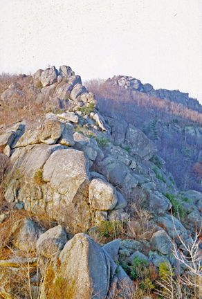 The next year, I was invited to go along with my friend Jay and his date to climb Old Rag Mtn. Jay and I had just completed a 10,000-mile road trip out west that summer. This hike/climb is classified as the toughest but most rewarding hike in the NP – some say in the entire Middle Atlantic Region. We chose a route starting from Skyline Drive at an elevation of about 3,500 feet (Limberlost Parking Area) and then dropping about 1500 feet into Weakley Hollow via the Old Rag Fire Road and on to the Old Rag Shelter. From there, the route went up the Saddle Trail to the Byrds Nest 1 Shelter, and then on to the summit at 3,291ft. It was about 10 miles roundtrip with a total gain of about 2800 feet.