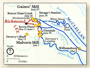The first Union attempt to take Richmond (Confederate Capital) and defeat the Southern rebellion took place at Bull Run in VA at the First Battle of Manassas in July 1861 (see Blog for June 2019). The Federal forces were defeated. The second attempt to take Richmond started in March 1862 under General George McClellan and was referred to as the Peninsula Campaign. His forces reached the east side of Richmond, but they were beaten back by General Robert E. Lee in the Seven Days Battles.