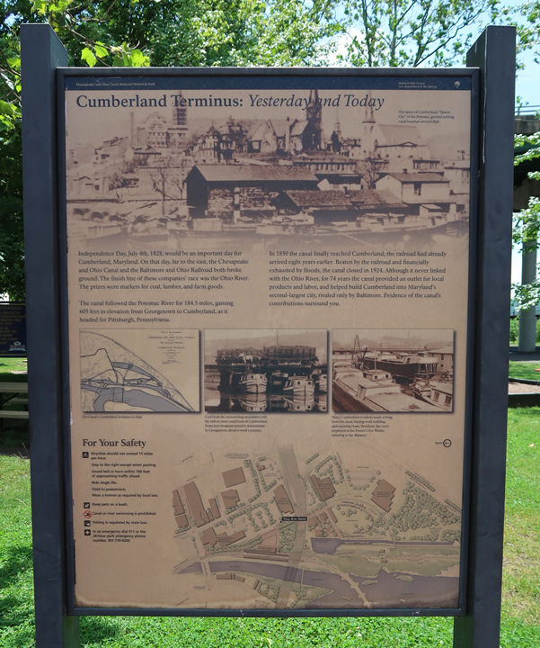 The Chesapeake (Bay) and OHIO Canal never made it to the Ohio River. Construction stopped here in Cumberland MD in 1850 when railroads made the continuing digging of the canal a financially losing proposition. 184.5 miles of the C & O Canal were completed from Georgetown (Washington DC) to Cumberland MD. The canal remained open until 1924.