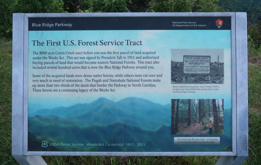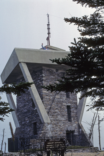 In 1915, high winds destroyed the obelisk and a 15-foot ladder, supported by three poles was placed on the summit. When Mount Mitchell State Park was created in 1916, a 15-foot covered wooden platform was constructed. In 1926, NC replaced the platform with a medieval looking stone tower. In 1928, a funeral cairn and plaque was placed on Mitchell’s grave. The word “University” is misspelled on the plaque! In 1959, a viewing platform was constructed on the 25-foot stone tower.