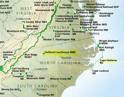 6hr drive to Guilford Courthouse National Military Park in NC – during my school history lessons, I learned a good deal about the northern battles of the Revolutionary War but relatively little about the southern battles. For example, there are three National Park Units in South Carolina devoted to the Revolutionary War – Ninety Six NHS, Cowpens NB, and Kings Mountain NMP. There are two in North Caroling – Moores Creek NB and Guilford Courthouse NMP.